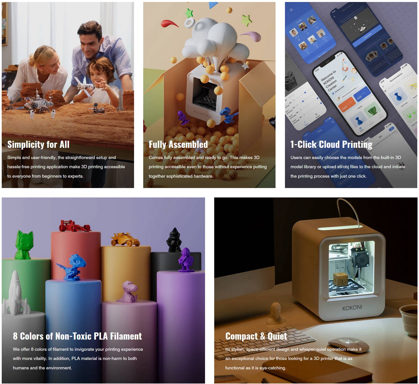 - - Plug & Play : Easy Printing with KOKONI EC1, comes fully assembled and calibrated, saving you time and hassle. Just unpack, plug in, and start printing immediately. Enter the world of 3D printing effortlessly and see your creations come to life in no time.